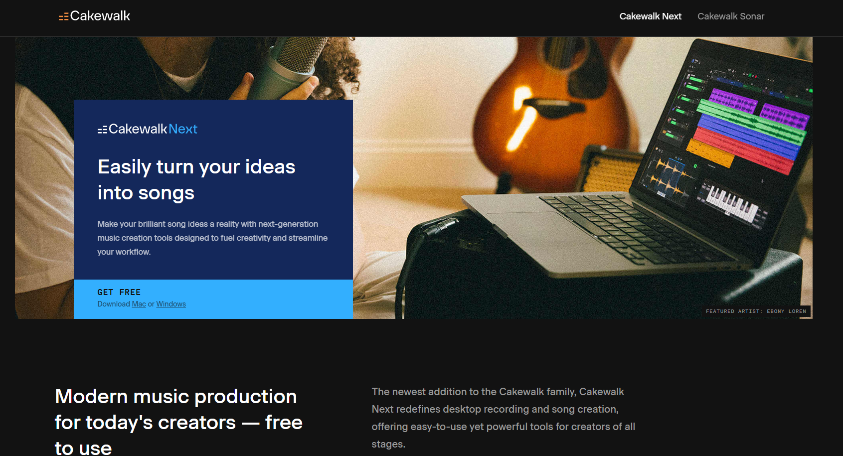 Cakewalk 사이트에 접속하여 GET FREE 부분에서 자신의 컴퓨터 기종에 맞는 인스톨러를 설치합니다.