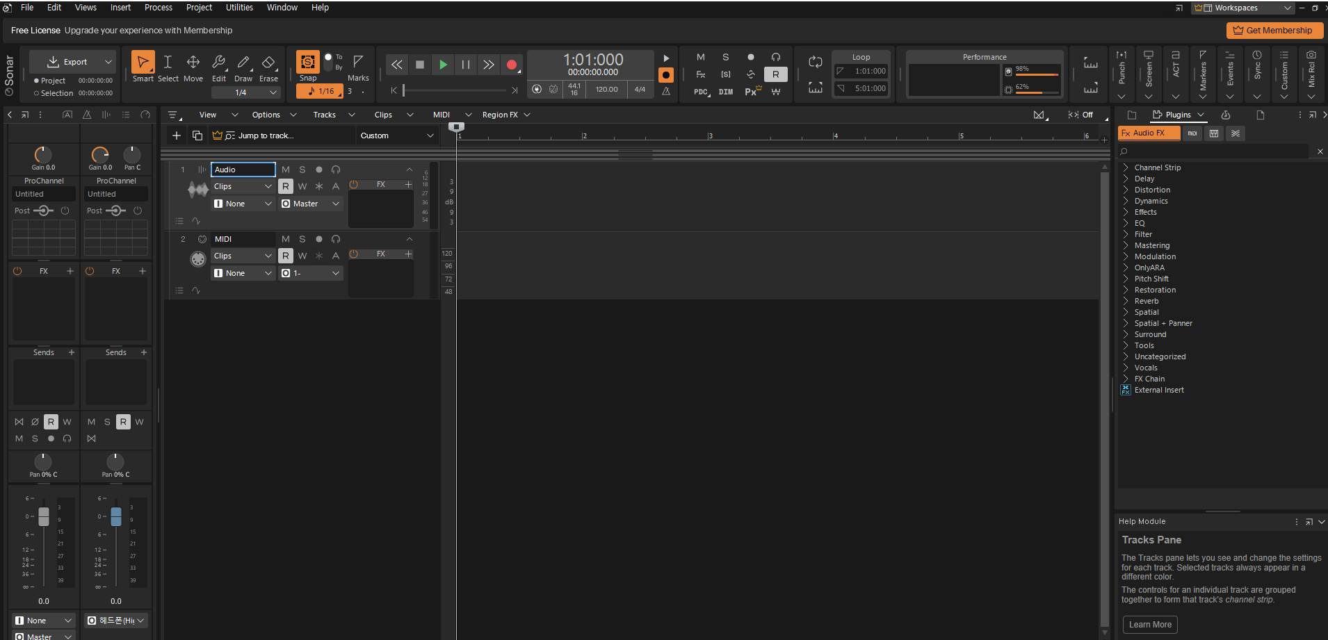 무료 버전 Cakewalk는 14초 후에 사용 할 수 있습니다. Create를 눌러 Basic 또는 왼쪽 상단의 File을 눌러 New를 선택합니다.